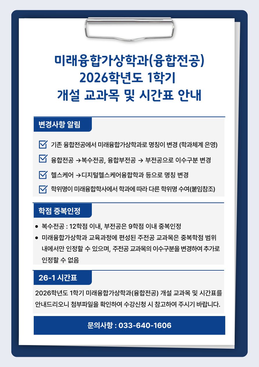 아래 첨부파일을(엑셀)을 확인하여 2026학년도 1학기 미래융합가상학과(융합전공) 수강 신청 시 참고하여 주시기 바랍니다.