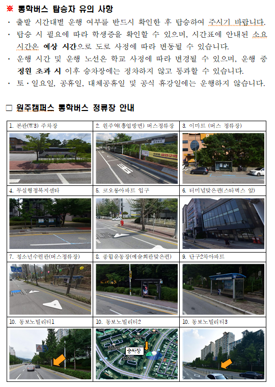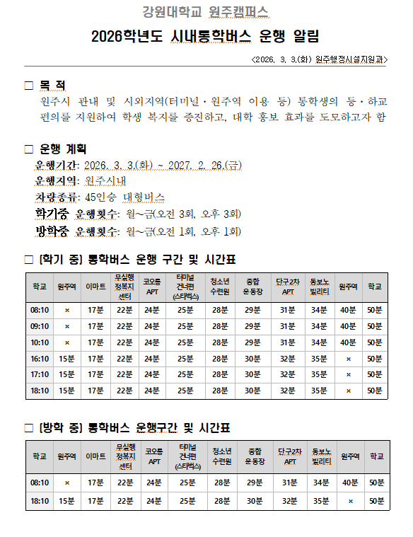 2026학년도 강원대학교 원주캠퍼스 시내 통학버스 운헹 알림