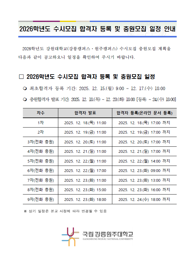 2026학년도 합격자 등록 안내 및 충원합격 발표 일정 안내