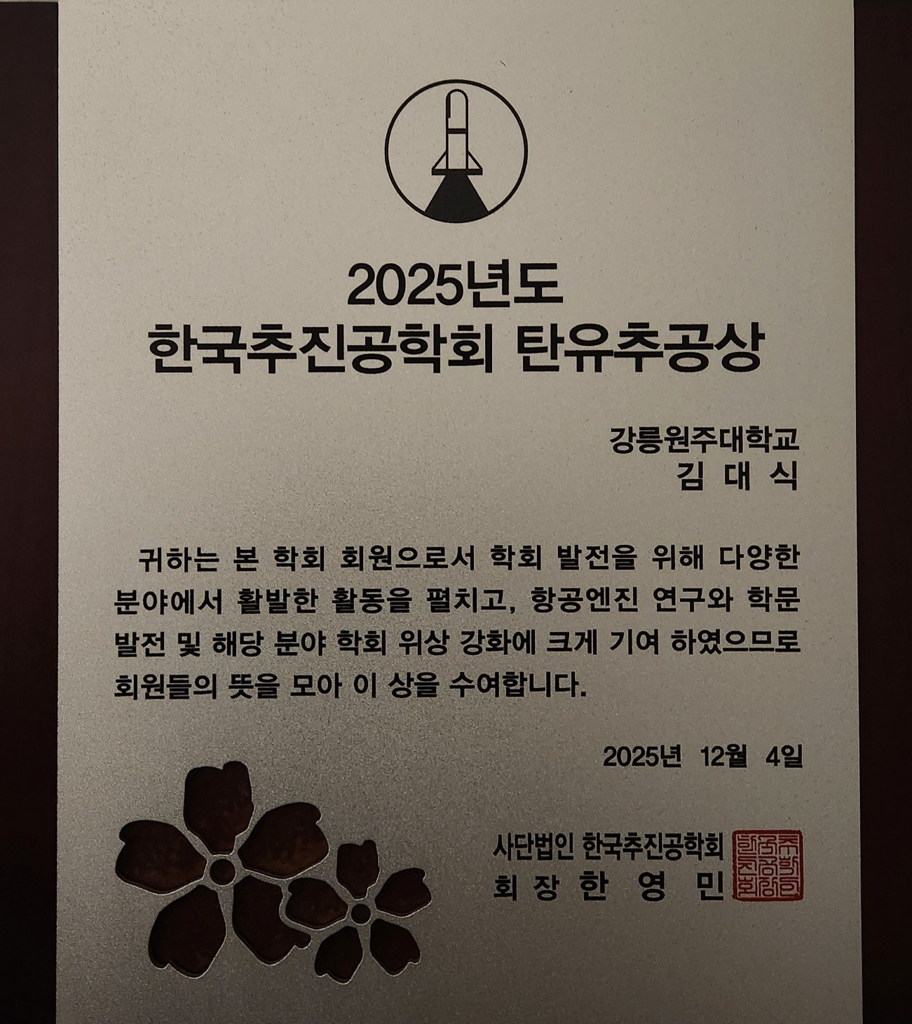 기계공학과 김대식 교수, 한국추진공학회 '탄유추공상' 수상