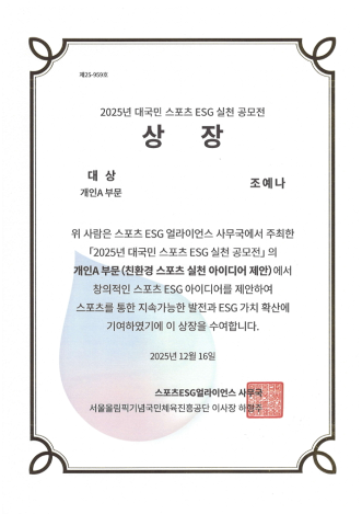 조예나 핵생은 창의적이고 실현 가능성이 높은 스포츠 ESG 실천 아이디어를 제안해, 스포츠 분야에서 환경 친화적 실천 가능성과 사회적 가치 확산에 기여한 점을 높이 평가받았다. 심사 결과, 스포츠를 통해 지속가능성 실현과 ESG 가치 확산에 기여한 점이 우수하다고 평가되어 대상 수상자로 선정됐다.
