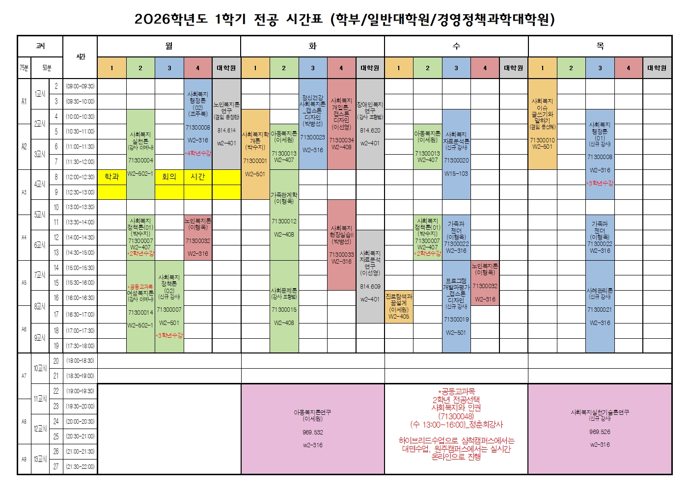 ※ 2026학년도 교육과정 개편으로 사회복지정책론, 사회복지행정론은 학년별 분반이 나눠져 있으므로 반드시 해당 학년분반으로 수강신청해야 함.